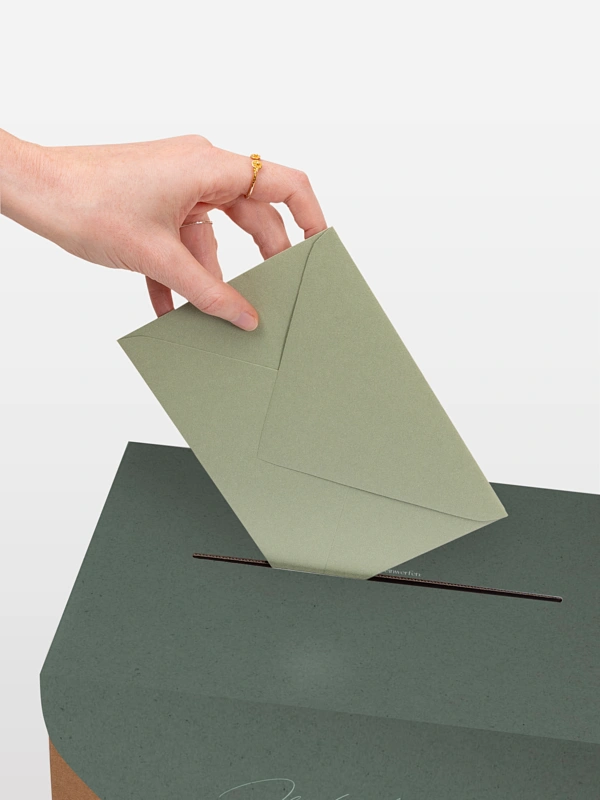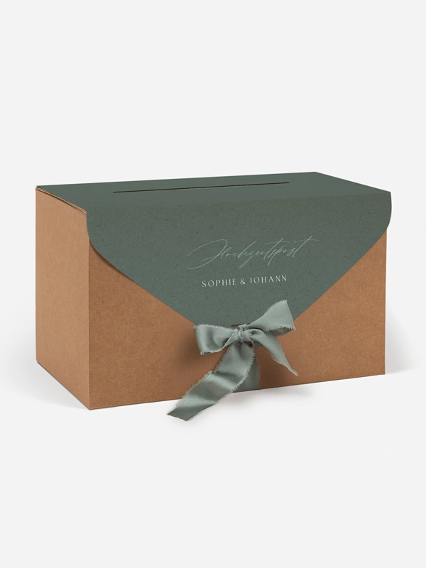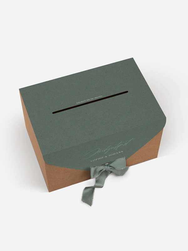 Unsere Kartenbox "Big Date" ist die perfekte Kombination aus Funktionalität und Eleganz. Sie sammelt sicher Glückwunschkarten, Umschläge und kleine Aufmerksamkeiten Ihrer Gäste. Die Kartenbox wird flach geliefert und lässt sich einfach zusammenbauen. Sie enthält eine individuell gestaltbare Papierhülle sowie ein farblich passendes Band. Nach dem Aufbau fügt sie sich stimmig in Ihr Papeterie-Konzept ein und wird zu einem dekorativen Blickfang mit praktischem Nutzen.