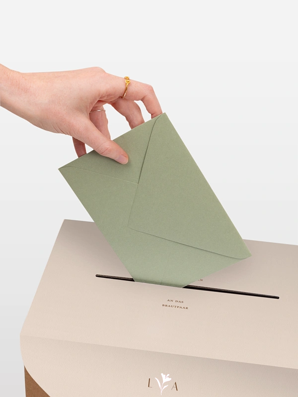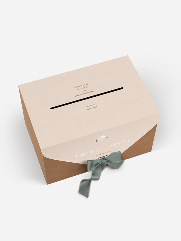 Unsere Kartenbox "Monogram muse" ist die perfekte Kombination aus Funktionalität und Eleganz. Sie sammelt sicher Glückwunschkarten, Umschläge und kleine Aufmerksamkeiten Ihrer Gäste. Die Kartenbox wird flach geliefert und lässt sich einfach zusammenbauen. Sie enthält eine individuell gestaltbare Papierhülle sowie ein farblich passendes Band. Nach dem Aufbau fügt sie sich stimmig in Ihr Papeterie-Konzept ein und wird zu einem dekorativen Blickfang mit praktischem Nutzen.