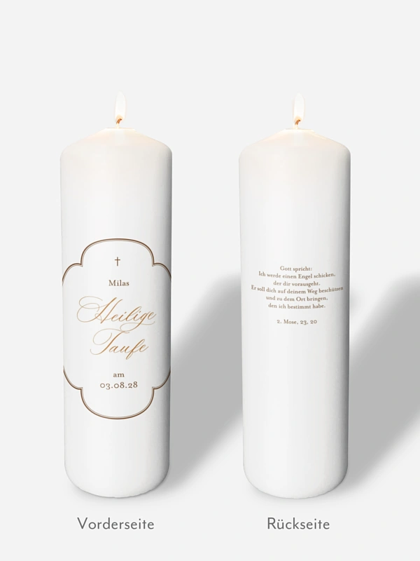 Die Kerze zur Taufe "Classic Garden" begleitet euren besonderen Tag mit einem leisen, warmen Leuchten – und wird danach zum schönen Erinnerungsstück für zuhause. Das zeitlose Design mit feinen Details wirkt festlich, ohne laut zu sein, und passt wunderbar zur Tauffeier oder als Geschenk von Pat:innen und Familie. Mit Name und Datum wird daraus eine persönliche Taufkerze, die eurem Moment eine eigene Handschrift gibt. Du kannst die Kerze ganz einfach im Gestaltungs-Tool personalisieren, und wir sorgen für hochwertige Qualität und schnelle Lieferung.