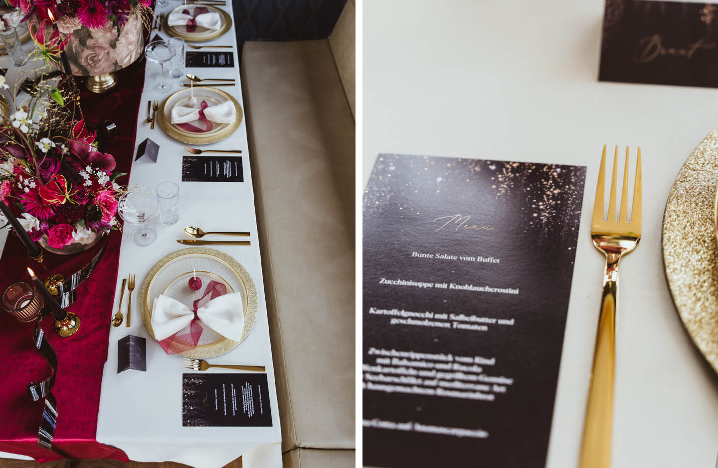 Die Hauptfarben hier sind Gold, Schwarz, Weiß und Viva Magenta, die Pantone-Farbe 2023. Die Farbe transportiert Leben und Leidenschaft, Freude und Optimismus – also sehr passend für den neuen gemeinsamen Lebensweg.