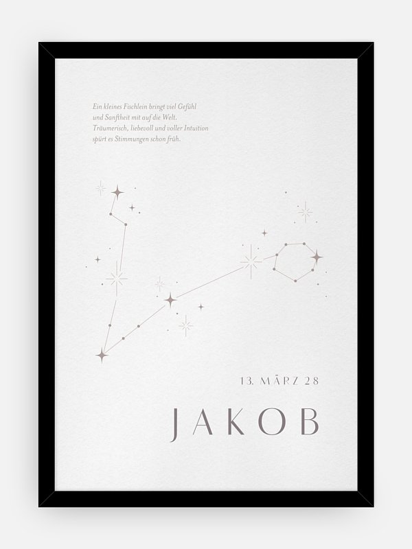 „Sternbild Fische“ fängt die träumerische, sanfte Energie dieses Zeichens ein. Das Geburtsposter ist wie eine kleine Erinnerung daran, den Moment mit Herz und Fantasie zu leben. Es passt wunderbar ins Kinderzimmer und ist ein besonderes Geschenk zur Geburt. Mit Liebe gestaltet und sorgfältig gedruckt.