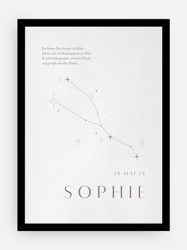 Mit dem Geburtsposter „Sternbild Stier“ bringst du Ruhe und Geborgenheit ins Kinderzimmer. Es erinnert dich jeden Tag daran, wie wertvoll Beständigkeit und Nähe sind. Ein herzliches Geschenk für frischgebackene Eltern, das lange Freude schenkt. Liebevoll gestaltet und schnell bei dir.