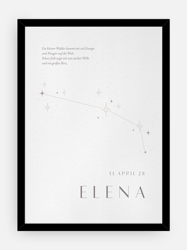 Das Geburtsposter „Sternbild Widder“ feiert den Start ins Leben voller Energie und Abenteuerlust. Es ist eine liebevolle Erinnerung daran, wie einzigartig und kostbar die ersten Momente deines Kindes sind. Wunderschön für das Kinderzimmer und ein besonderes Geschenk zur Geburt. Hochwertig gedruckt und mit viel Herz gestaltet.