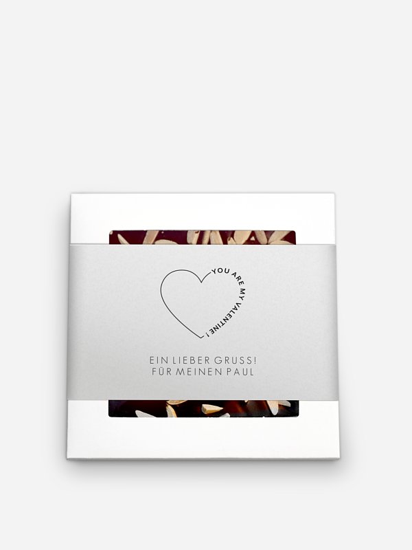 Verschenken Sie die handgeschöpfte Pralinenschokolade mit der personalisierbaren Hülle "You are my Valentine" und verwöhnen Sie Ihre Liebsten zu Weihnachten. Handgeschöpfte Pralinenschokolade mit gerösteten Mandelsplittern Zutaten: Premium-Zartbitterschokolade (Kakaomasse; Zucker; Kakaobutter; Emulgator: SOJAlecithin; natürliches Vanille-Aroma), geröstete MANDELsplitter 10 % Kakao: mindestens 60 % in der Edel-Zartbitter-Schokolade Hergestellt in Deutschland Bitte kühl, dunkel und trocken lagern Gewicht: 80 g