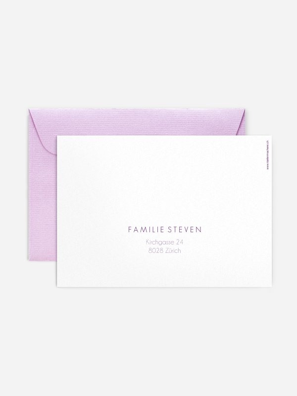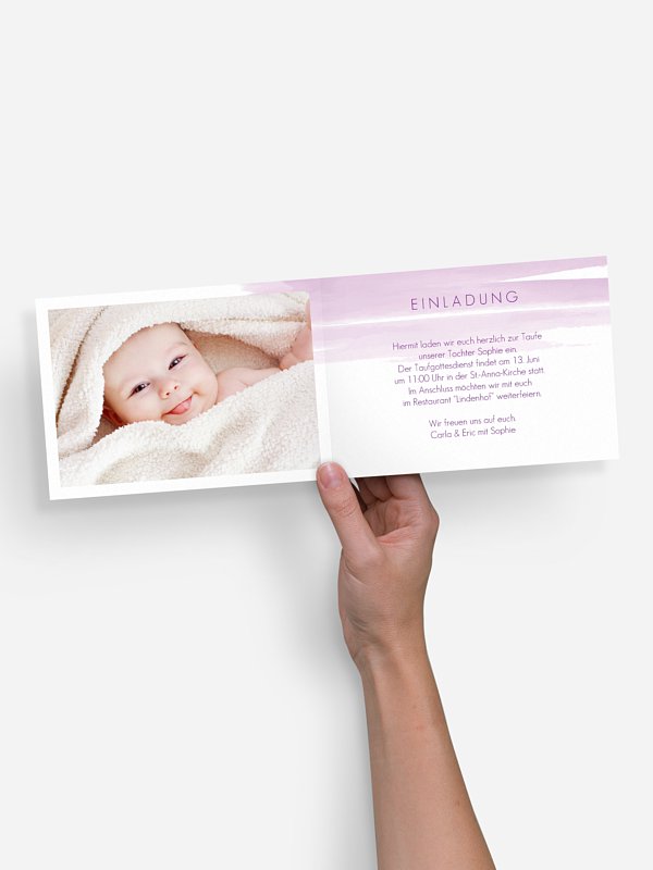 Wie mit zarten Wasserfarben gemalt: Die Taufeinladung „Aquarellbild” mit der Friedenstaube als zentralem Element ist eine klassische und gleichzeitig moderne Papeterie, um stilvoll zur Taufe Ihres Kindes einzuladen.