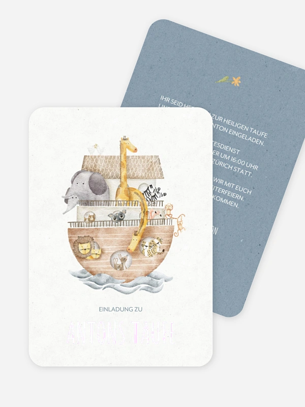 Die Taufeinladung "Arche" verzückt mit einer liebevoll gestalteten Arche samt niedlicher gemalter Tiere. Teilen Sie mit diesem liebevollen Design Ihren besonderen Moment mit Ihren Lieben.