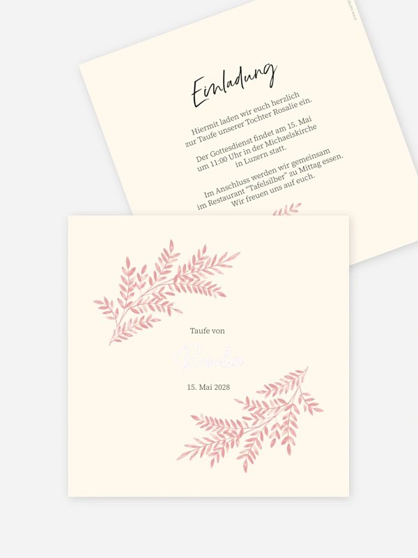 Ein ganz besonderer Segen steht bevor und mit der Taufeinladung "Baptism Day" kannst du dieses Herzensereignis auf liebevolle Weise ankündigen. Die zarten, illustrierten Blattranken umrahmen eure Einladung zur Taufe besonders sanft und lassen viel Raum für die Vorfreude auf diesen gemeinsamen Tag.