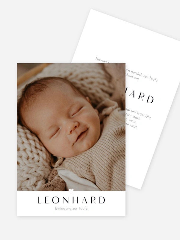 Mit der Einladung zur Taufe "Herzensgold" lädst du deine Lieblingsmenschen ein, diesen ersten Meilenstein im Leben deines Schatzes gemeinsam zu feiern. Das sanfte Design rückt das friedliche Lächeln deines Lieblings ganz liebevoll in den Mittelpunkt und schafft eine herzliche Vorfreude auf euer gemeinsames Fest.