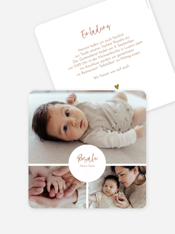 Mit der Taufeinladung "Kleines Herzensglück" kündigst du das erste bedeutsame Fest deines Schatzes auf besonders liebevolle Weise an. Das verspielte Design mit den zarten Foto-Ausschnitten rückt die ersten Meilensteine deines Lieblings ganz ohne Ablenkung in den Fokus und lässt eure gemeinsame Geschichte für sich sprechen.