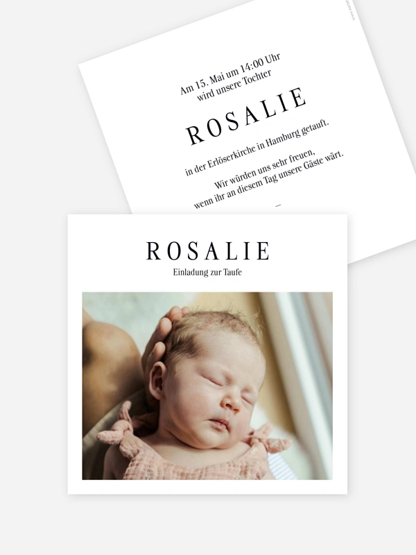 Mit der Einladungskarte zur Taufe "Liebesrefrain" lädst du deine Lieblingsmenschen auf besonders herzliche Weise zur Taufe deines Schatzes ein. Das schlichte Design lässt viel Raum für deine schönsten Momente und macht eure Vorfreude auf diesen besonderen Tag für alle sichtbar.