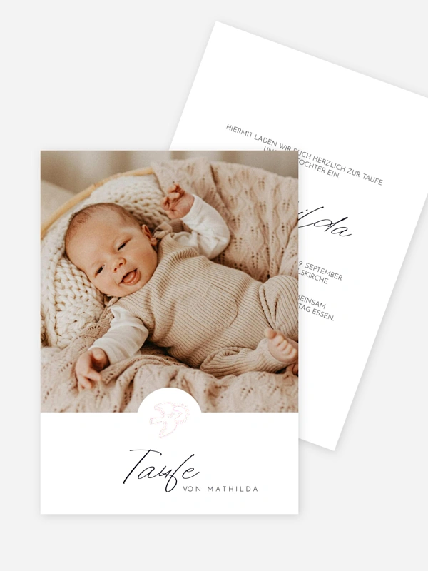Mit der Einladung zur Taufe "Taubentanz" bittest du deine Lieblingsmenschen auf besonders herzliche Weise zum ersten Fest deines Schatzes. Das sanfte Design mit dem zarten Tauben-Symbol und eurem liebsten Kuschelfoto lässt die Vorfreude auf diesen gemeinsamen Meilenstein direkt spürbar werden.