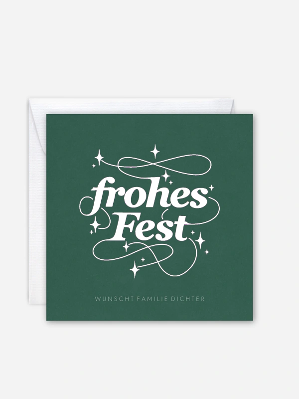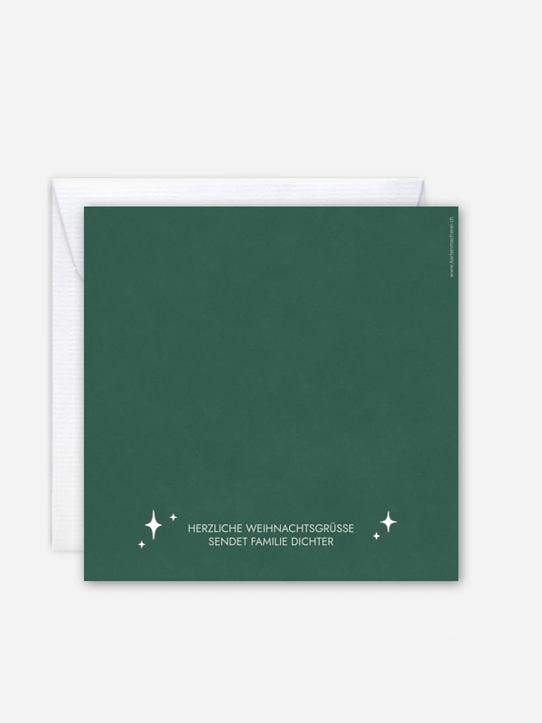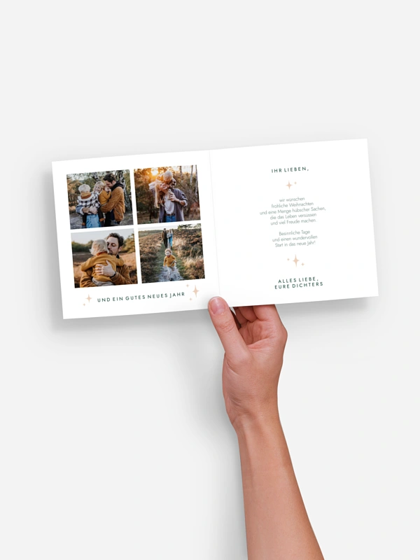 Verleihe deinen Weihnachtsgrüßen einen ganz besonderen Schimmer mit unserer eleganten Weihnachtskarte "Festglanz". Die moderne, glänzende Schrift strahlt pure Festtagsfreude aus, während im Inneren viel Platz für deine liebsten Fotos und herzliche Worte ist. So wird deine Weihnachtspost zu einem stilvollen und persönlichen Gruß für all deine Lieblingsmenschen. Deine Karten werden auf hochwertigem Papier gedruckt und kommen dank schneller Lieferung pünktlich zum Fest bei dir an.