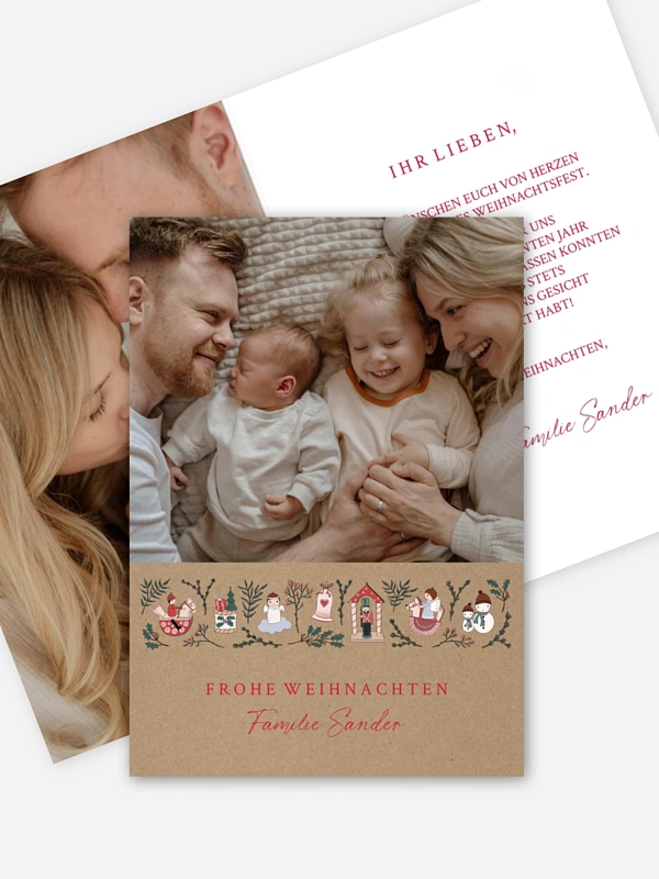 Sende fröhliche Weihnachtsgrüße mit unserer verspielten Fotokarte "Santa's Little Parade". Die liebevoll illustrierte Parade kleiner Weihnachtsfiguren verleiht deinem Familienfoto einen zauberhaften und fröhlichen Rahmen. So teilst du deine Freude und deine liebsten Momente auf eine besonders herzliche Weise. Dank der hochwertigen Druckqualität kommen dein Foto und die feinen Details der Illustrationen wunderbar zur Geltung und machen deine Weihnachtspost zu etwas ganz Besonderem.
